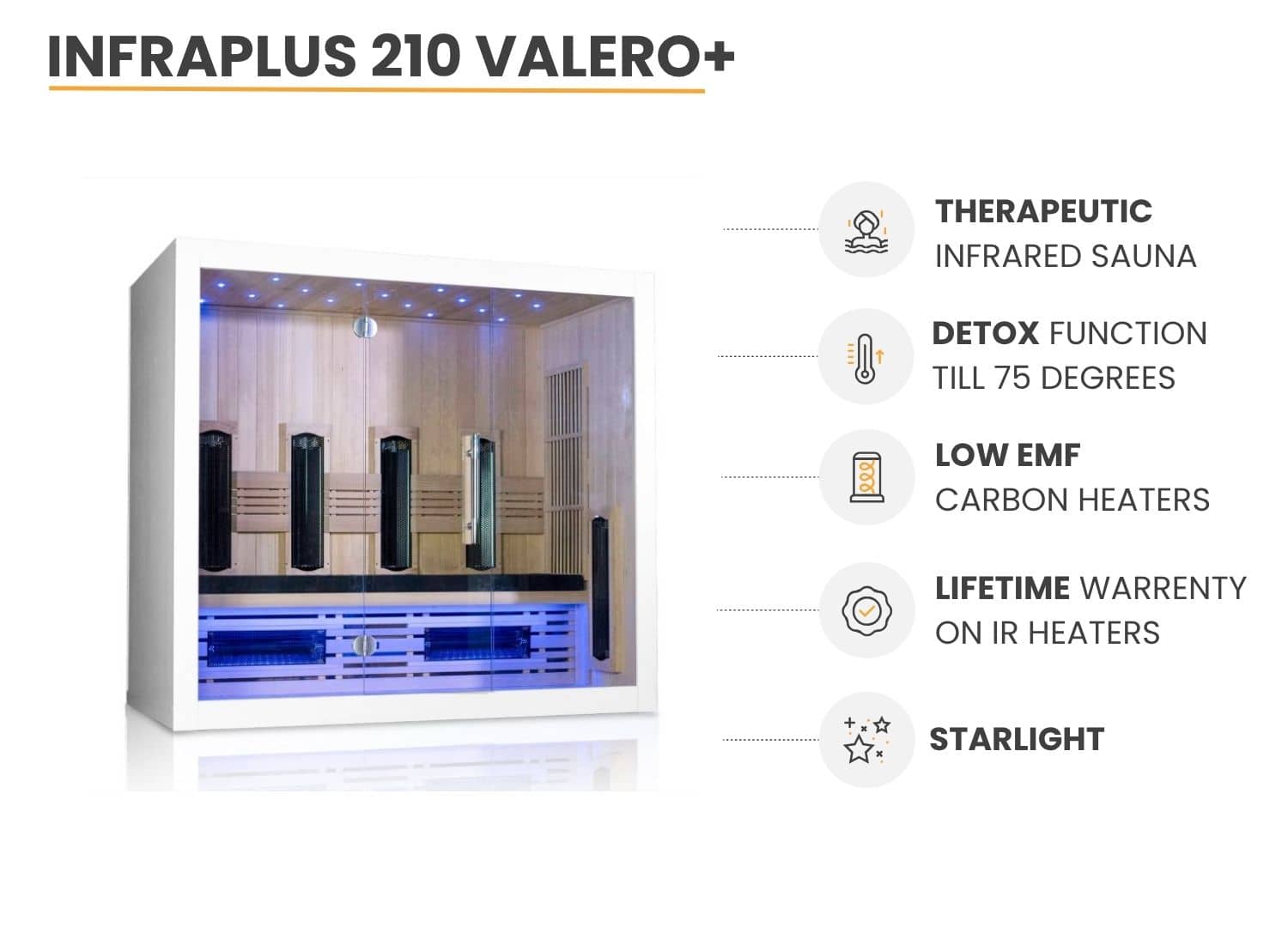 Infraplus macht es möglich Ihre Kabine mit Infraheat Vollspektrum-Strahlern auszustatten (wahlweise). So haben Sie nicht nur Mittel- und Langwelleninfrarot IR-Wärme, sondern auch einen Teil Kurzwellen (IR-A). Kurze Wellen dringen noch tiefer in Ihre Hautlagen ein, wodurch der therapeutische Wert erhöht und Muskeln und Gelenke schneller erreicht werden. In Absprache mit dem Kunden sorgen wir für die perfekte Balance in Ihrer IR-Sauna. Die Vollspektrum-Strahler können auf kundenspezifischen Wunsch platziert werden, sodass für jeden eine passende Konfiguration möglich ist.