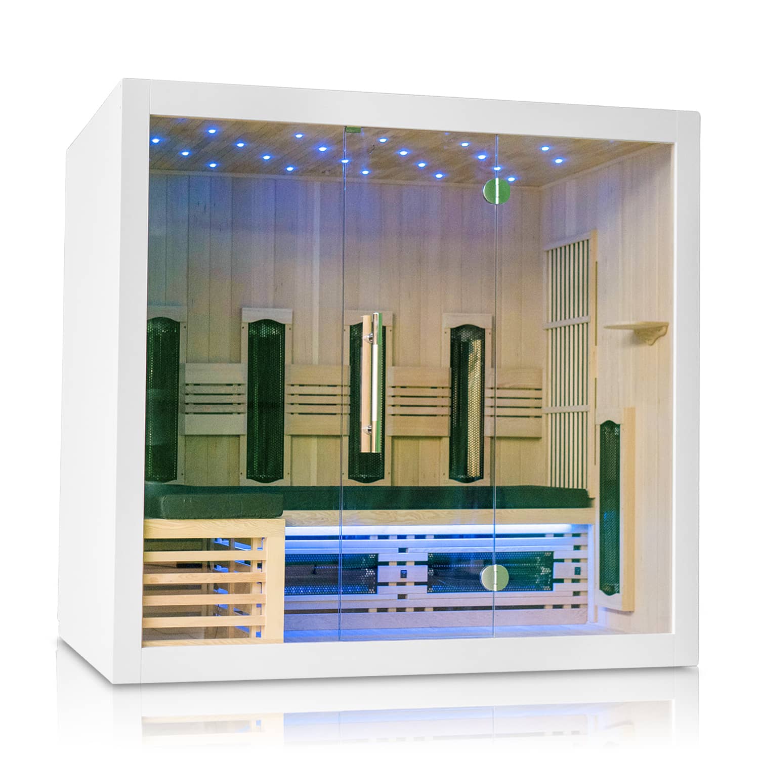 Unsere 3-4-Personen Infrarotkabine 185 Valero passt dank ihres modernen Designs und der großen Glasfront perfekt in een zeitgemäßes Interieur. Durch die schlichte Ausführung der Sauna besteht die Möglichkeit, die Kabine einzubauen, wodurch sie vollständig in Ihrem Interieur aufgeht. Aber auch als freistehende Sauna bietet sie einen eleganten Look. Diese Kabine ist an der Außenseite immer in Weiß ausgeführt. So ist die Kabine neutral und lässt sich nach Belieben kombinieren und integrieren. Der exakte Farbton ist RAL 9003 Weiß matt. Sie ist mit 9 Infraheat™-Strahlern ausgestattet.