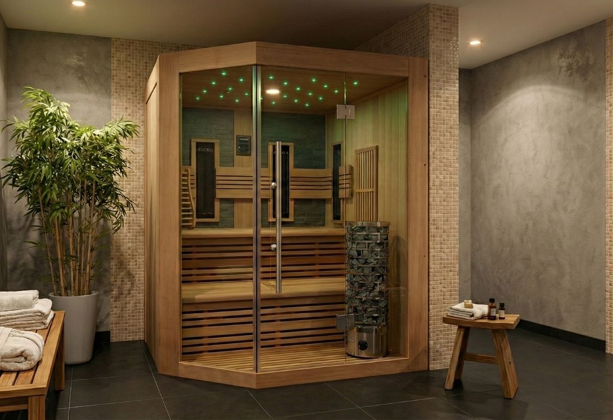 Wenn Sie sich nicht zwischen einer traditionellen Sauna und einer Infrarotkabine entscheiden können, dann ist eine Kombinationssauna etwas für Sie! Sie können in einer Kombisauna entweder eine Infrarotsitzung genießen oder eine Saunasession machen. Eine Infrarotkabine braucht nicht lange, um auf Temperatur zu kommen und ist so ideal für „zwischendurch“. Die traditionell finnische Sauna können Sie immer dann nutzen, wenn Sie etwas mehr Zeit haben. Für die traditionell finnische Sauna heizen Sie die Kabine eine halbe bis dreiviertel Stunde vor. Der 380 Volt Ofen bringt Ihre Kabine auf maximal 80 Grad. Hier können Sie auch nach Belieben Aufgüsse mit verschiedenen Aufgusskonzentraten machen.